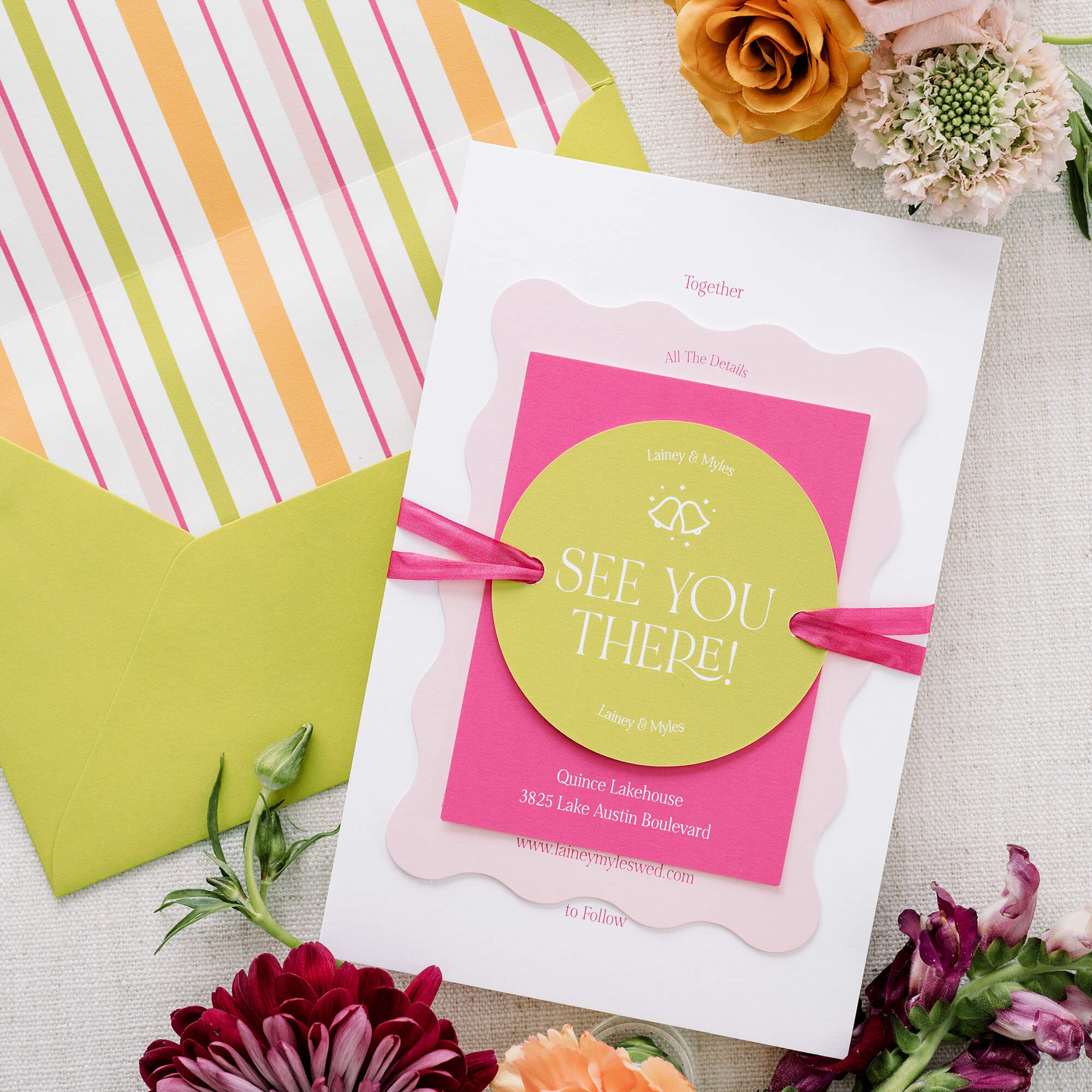Bright, bold, and playful, Fruit Punch brings high color and high style together with wavy die cuts, vibrant hues, and a custom ribbon tie.