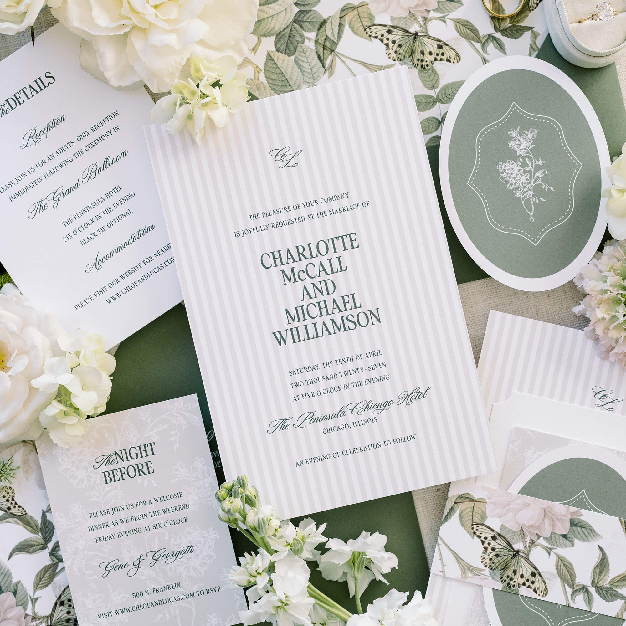 Timeless and tailored, The Windsor blends vintage florals, structured serif typography, and classic green and cream tones for an invitation that feels stately and sophisticated.