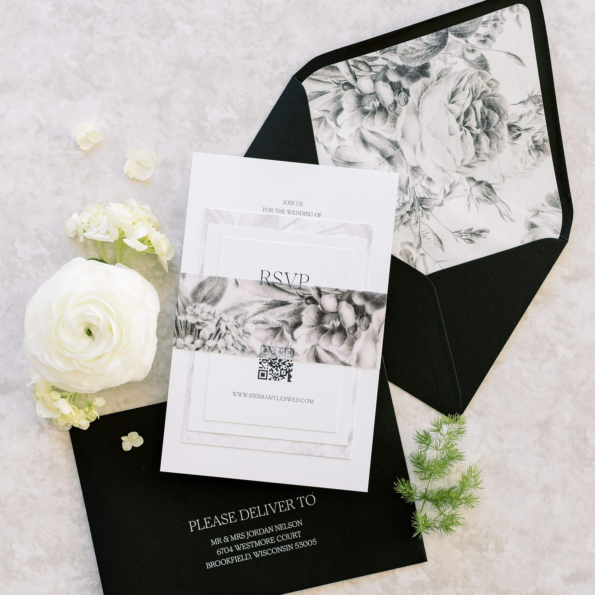 Minimal and striking, The Slate pairs bold black-and-white typography with subtle toile detailing and a vellum belly band for clean, modern contrast.