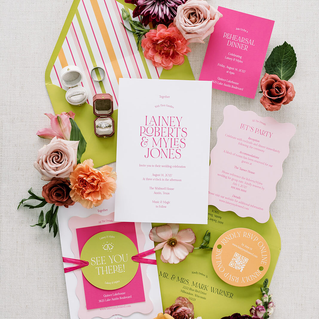 Featured in Brides, The Knot, Wedding Chicks and more, we’ve made our most-requested custom features (die-cuts, color palettes, luxe print finishes) available in a fresh, semi-custom format that just works.