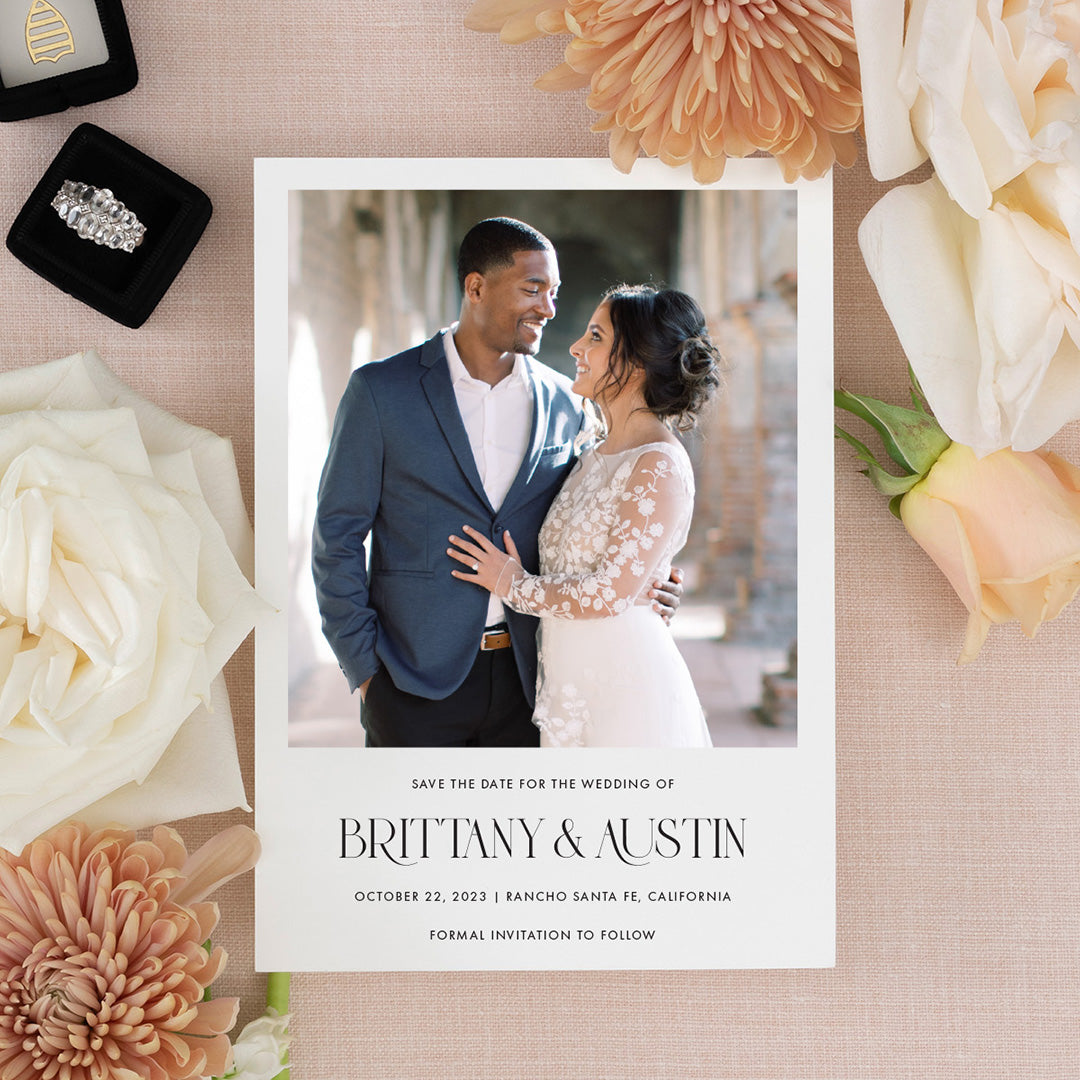 Designed with a bold display font and charming finishing touches, this wedding invitation suite delivers high-impact style without feeling overdone. It’s a modern take on tradition, printed on luxe cardstock that feels just as elevated as it looks.