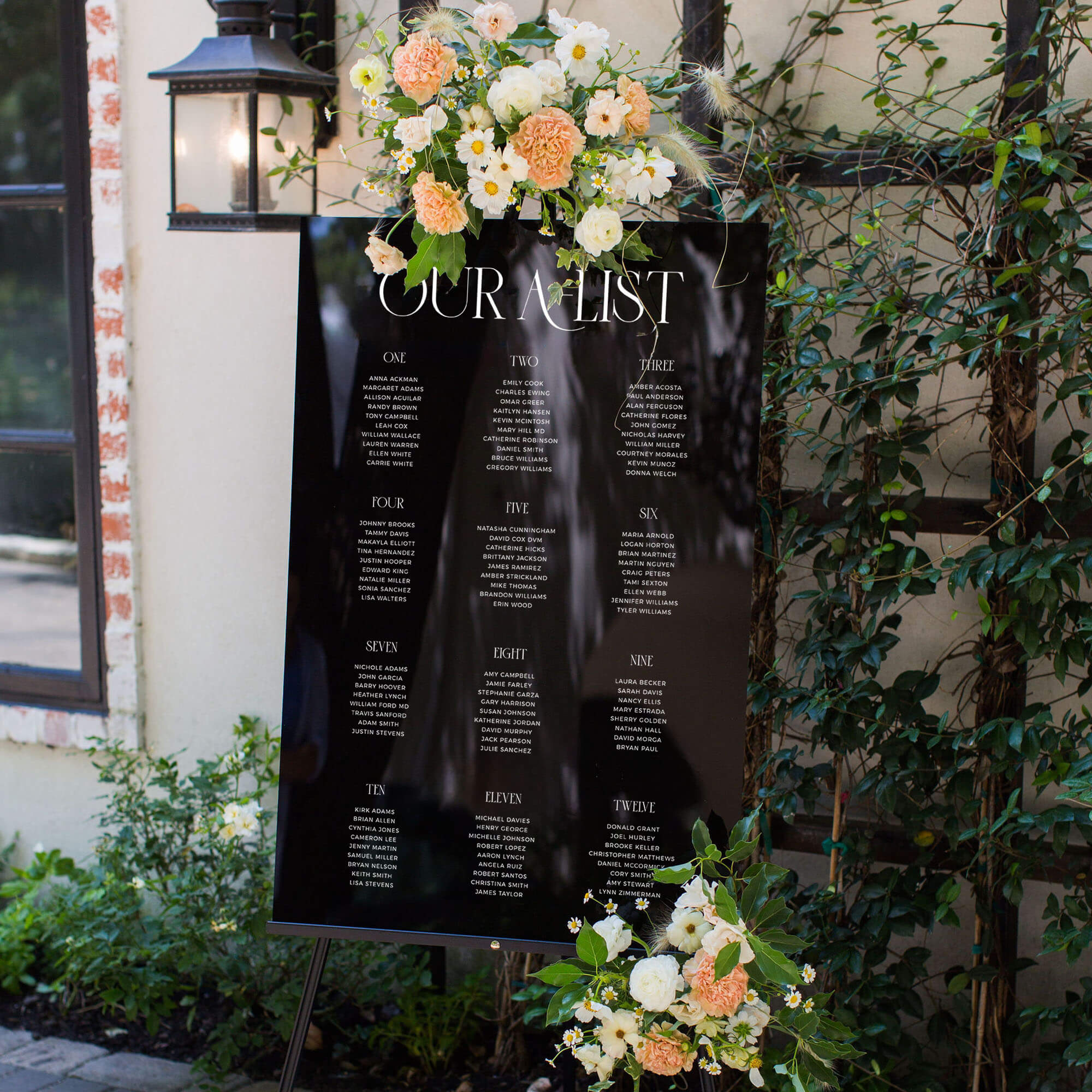 Accommodates up to 285 guests if listed alphabetically, or 20 tables if listed by table number.