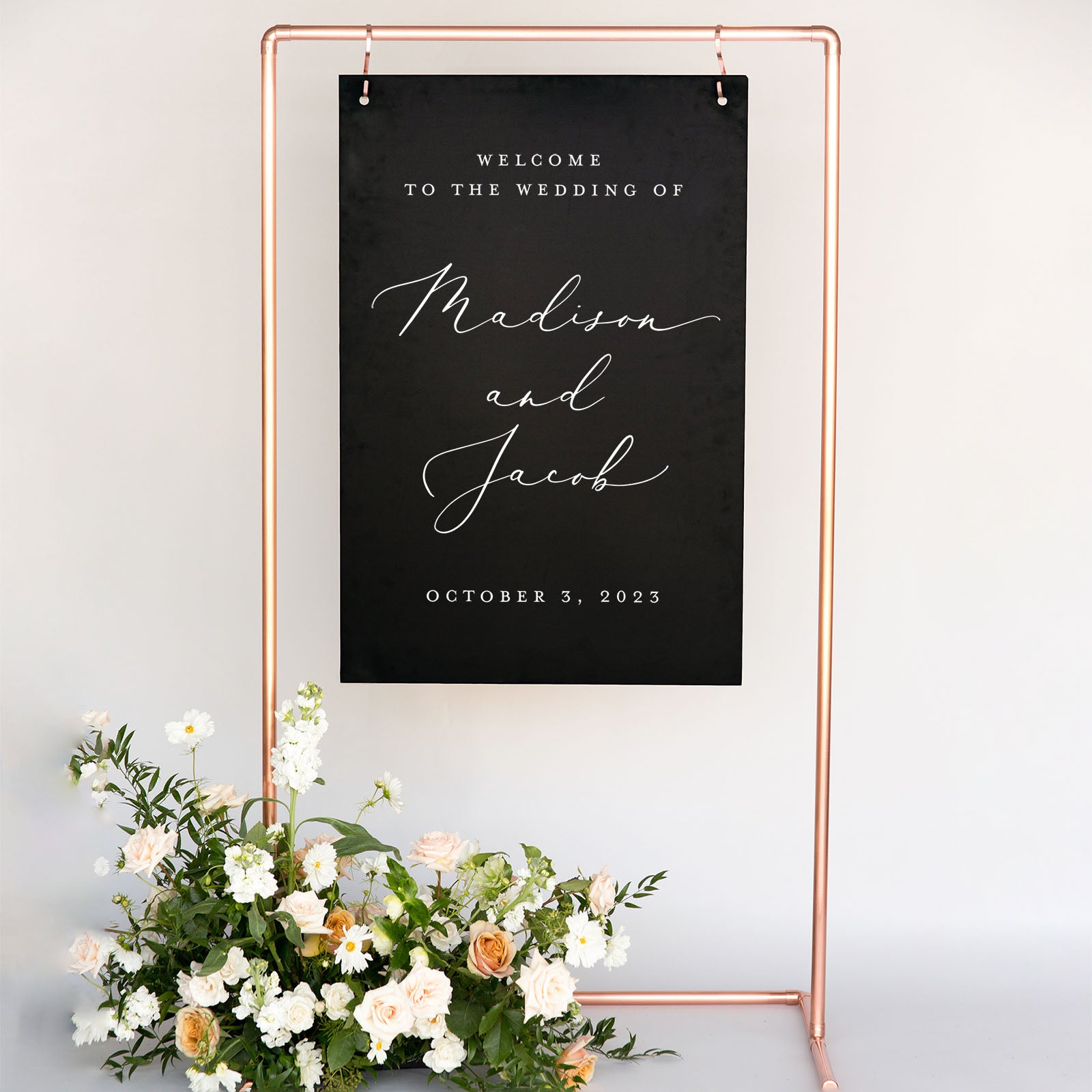 Customizable with your names and wedding date, this handcrafted sign can be used as a ceremony decor option or a wedding reception welcome sign. Available in a variety of sizes and custom color options the Madison wedding welcome sign will elevate your event decor with beautiful, classic sophistication.